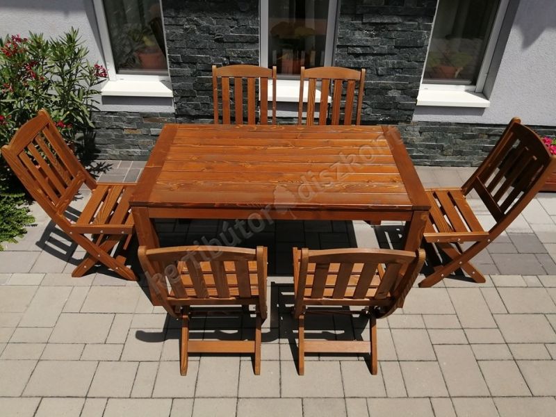 Masszív, 6 személyes teraszbútor,stabíl összecsukható székekkel,középmagas háttámlával.